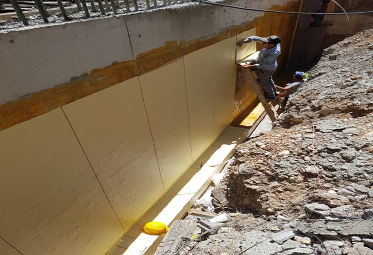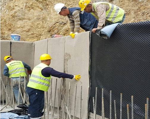 Sikaproof üzerine XPS Levhalar kendinden yapışkanlı upim çivileri ile perde yüzeyine sabitlenir. Drenaj Koruma Levhası perde yüzeyine asılarak dolguya hazır hale getirilir.