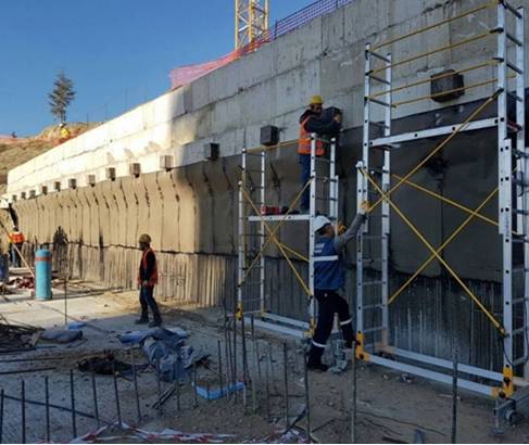 Çift Yüz Perde Yalıtımı : Betonarme perde yüzeyinde bulunan tij delikleri yapısal tamir harçları ile doldurulur, perde yüzeyinde oluşan segregasyonlar yine yapısal tamir harçları ile tamir edilerek perde yüzeyi pürüzsüz bir hale getirilir.