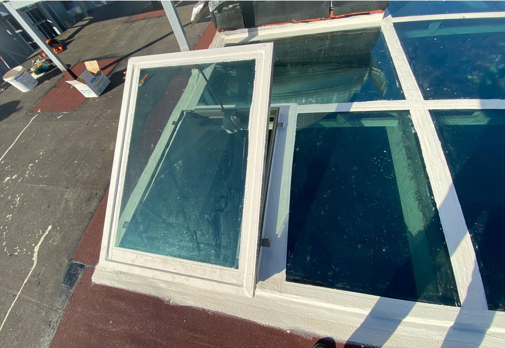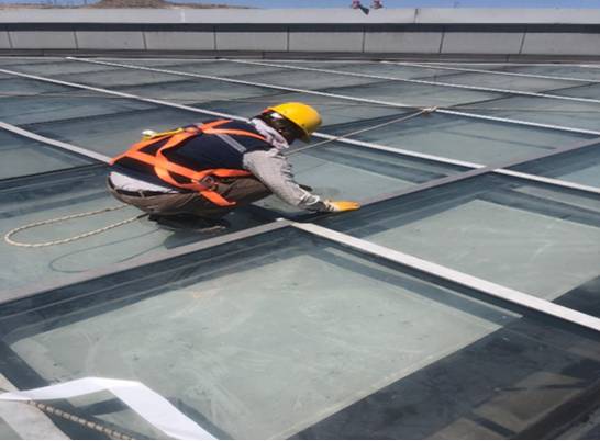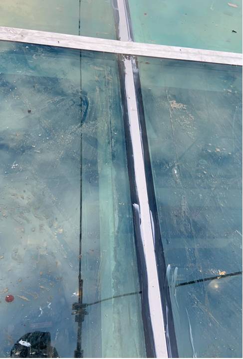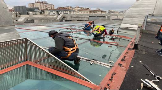 Skylıght cephe derzlerindeki deforme olan mastikler yenilenerek, her iki cam yüzeyi 20cm eninde temizlenir.