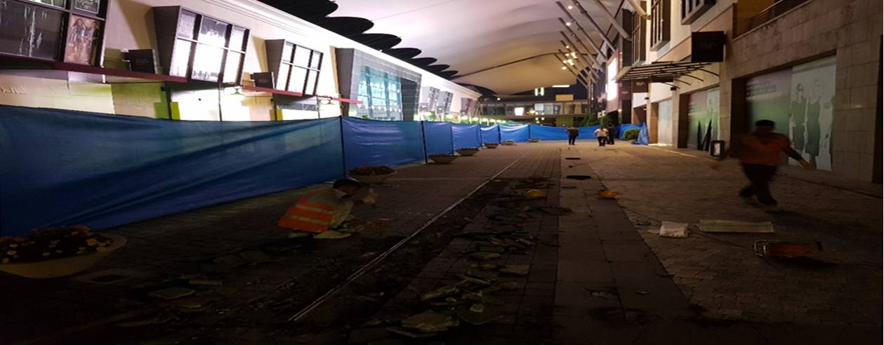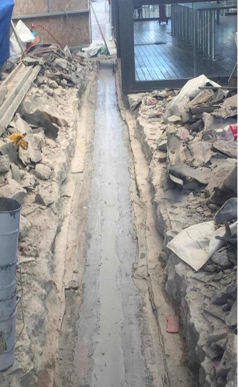 Forum ankara moda sokağında bulunan dilatasyon yalıtımı için alan çadır branda ile dışarıya kapatıldı, zemindeki taşlar söküldü, koruma betonu ve eğim betonu kaldırılarak dilatasyona ulaşıldı.
