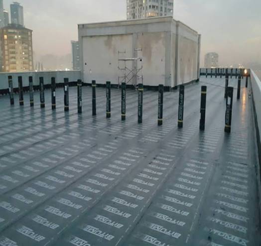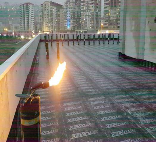 Eğim betonu atılmış teras yüzeyinde merkez dönüşlere yapısal tamir harcı ile köşe pahı yapıldı. Tüm teras yüzeyine bitüm astar sürüldü. İki kat bitümex membran tam yapıştırma usulü ile yapıştırıldı.     Yalıtım üzerine sı doldurularak 72 saatlik su testi yapıldı.