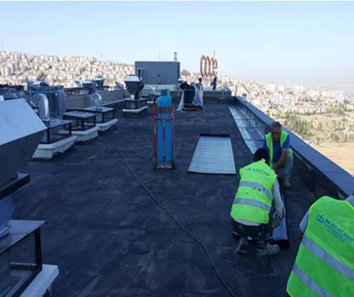 Tüm teras yüzeyine bitüm astar sürüldü. İki kat Ondulıne membran tam yapıştırma usulü ile yapıştırıldı.    Yalıtım üzerine su doldurularak 72 saatlik su testi yapıldı.